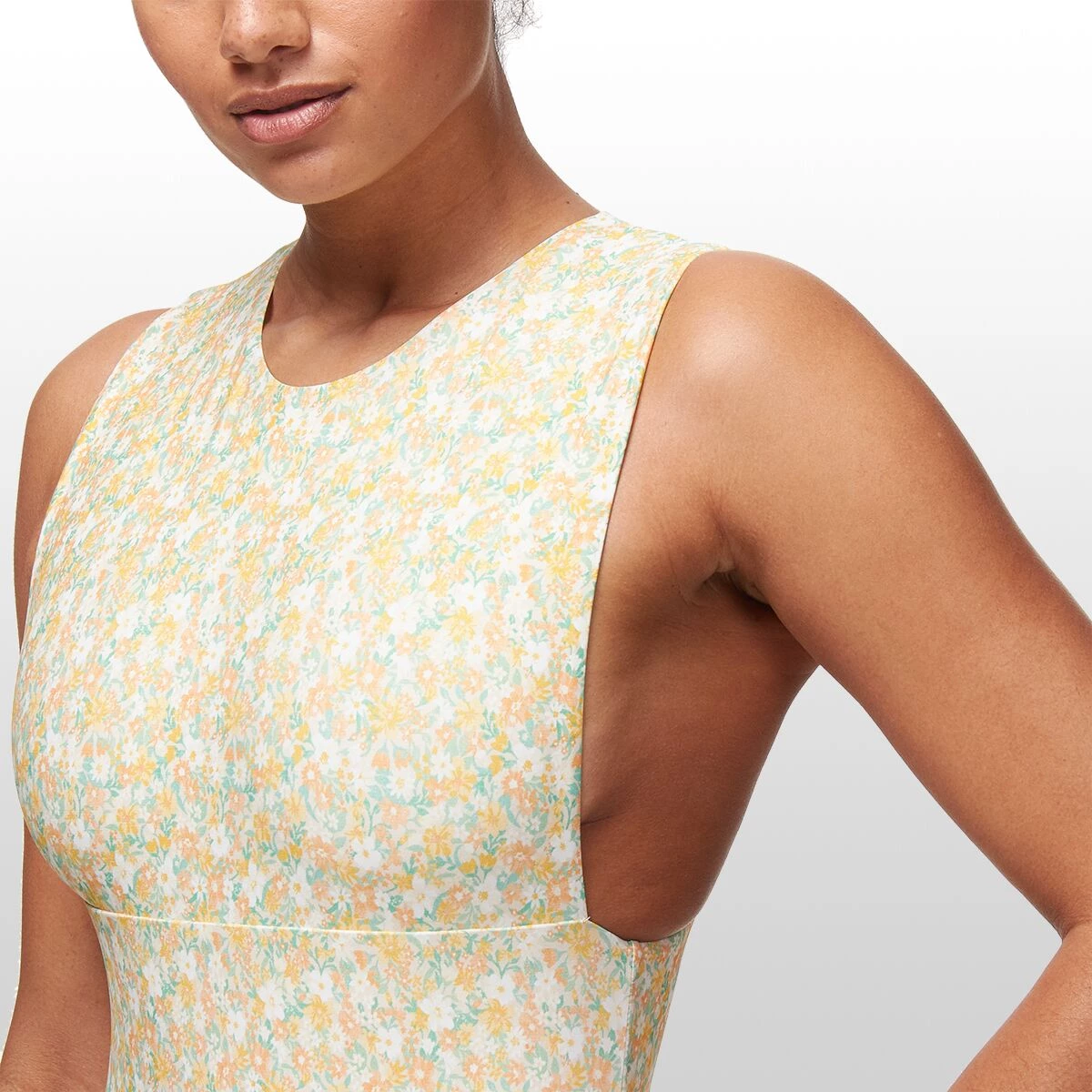- Front and back paneled swimsuit with open sides